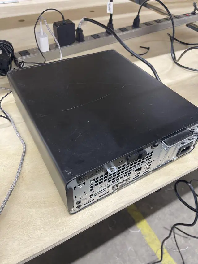 The Small Form Factor chassis helps save desk space while maintaining practical performance for workplace environments. A WiFi/Bluetooth dongle and power cord are included for convenient setup.