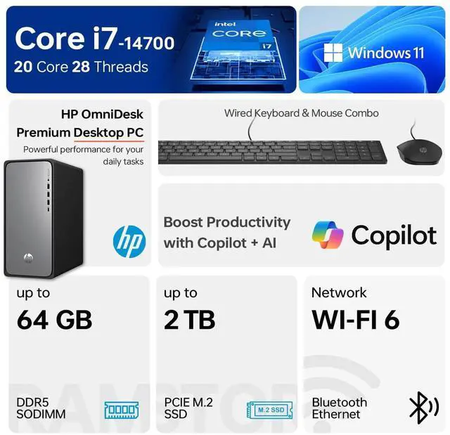 CPU: Intel Core i7-14700 Processor (20 Cores, 28 Threads, 33 MB L3 Cache, 2.1 GHz base frequency, up to 5.4 GHz max turbo frequency)