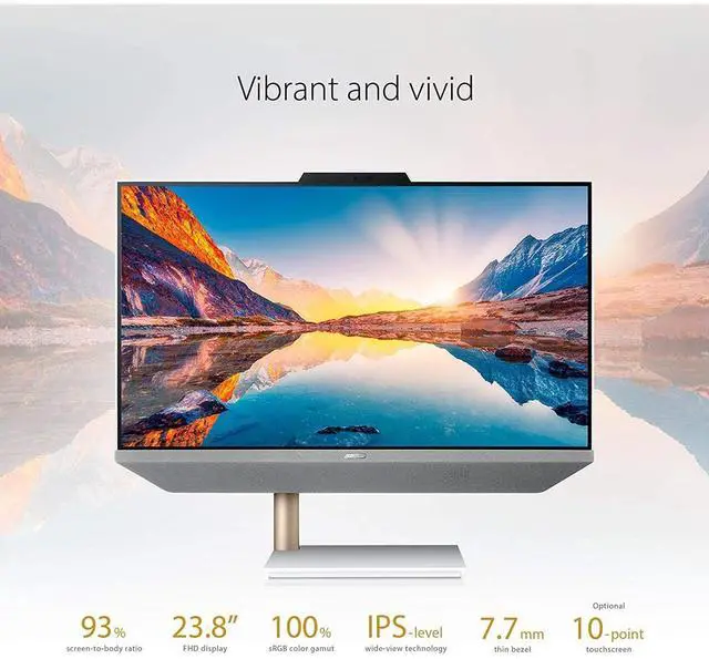 Display - Unbounded multitouch brillianceThe beautiful 23.8 -inch NanoEdge display on Zen AiO 24 has an incredibly thin 2.8 mm bezel. The upshot is a big, beautiful screen in the smallest conceivable space - with a remarkable 93% screen-to-body ratio. With touchscreen1 technology, Zen AiO 24 makes interacting with your various applications easier than ever, putting every command at your fingertips. Also, the panel serves up IPS-level visual brilliance, delivering 100% sRGB color gamut. With ASUS Splendid technology included, it's easy to fine tune the display for image perfection.