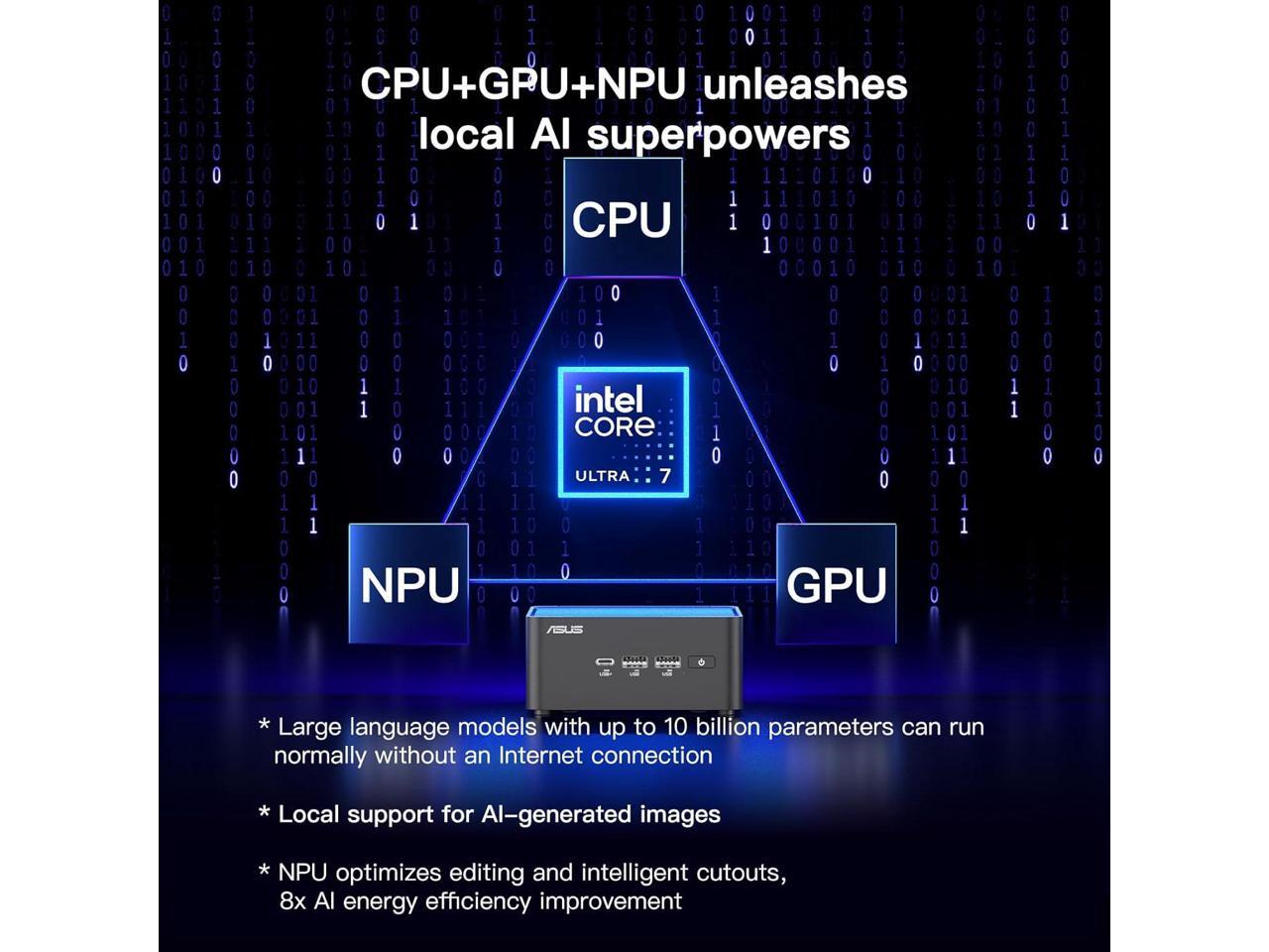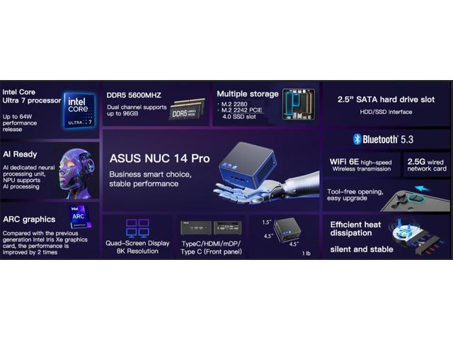 ASUS NUC 14 Pro Slim Mini PC Intel Core Ultra 7 155H Intel Arc Graphics 32GB DDR5 RAM 2TB PCIe SSD Thunderbolt 4 Wi-Fi 6E Bluetooth 5.3 Support 8K / 4K Quad Monitors Windows 11 Pro | VESA Mount
