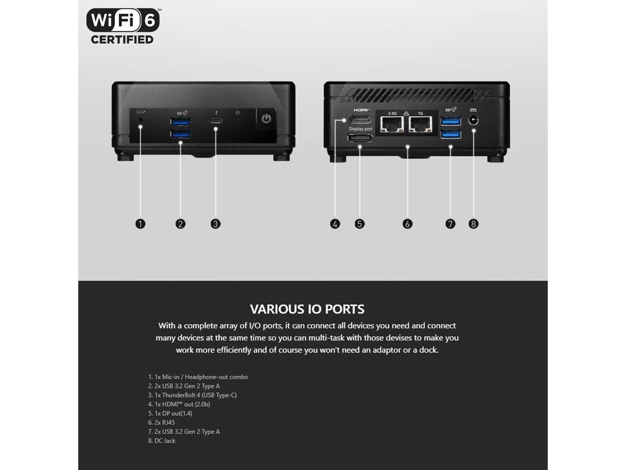 - [Teach Specs] Front Ports: 1 x Mic-in / Headphone-out combo, 2 x USB 3.2 Gen 2 Type A, 1 x Thunderbolt 4 (Type-C); Rear Ports: 1 x DisplayPort Out, 1 x HDMI 2.1, 2 x RJ-45 (LAN), 2 x USB 2.0 Type A, 1 x DC Jack; Wi-Fi 6 and Bluetooth