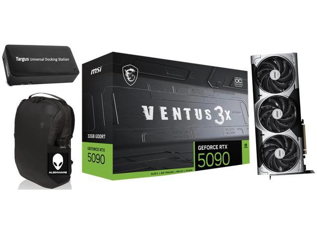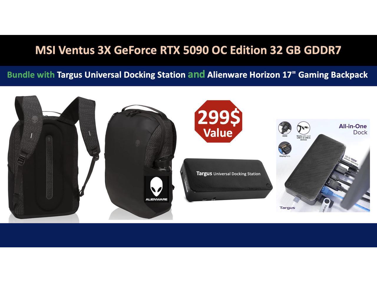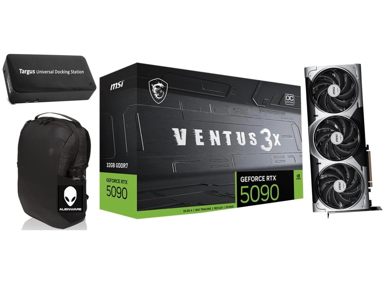 MSI Ventus 3X FeForce RTX 5090 OC Edition 32GB GDDR7, PCI Express Gen 5, Clocks Extreme: 2452 MHz, CUDA CORES 21760 Units, Memory Speed 28 Gbps. Bundle with Targus dockstation and Alienware Backpack