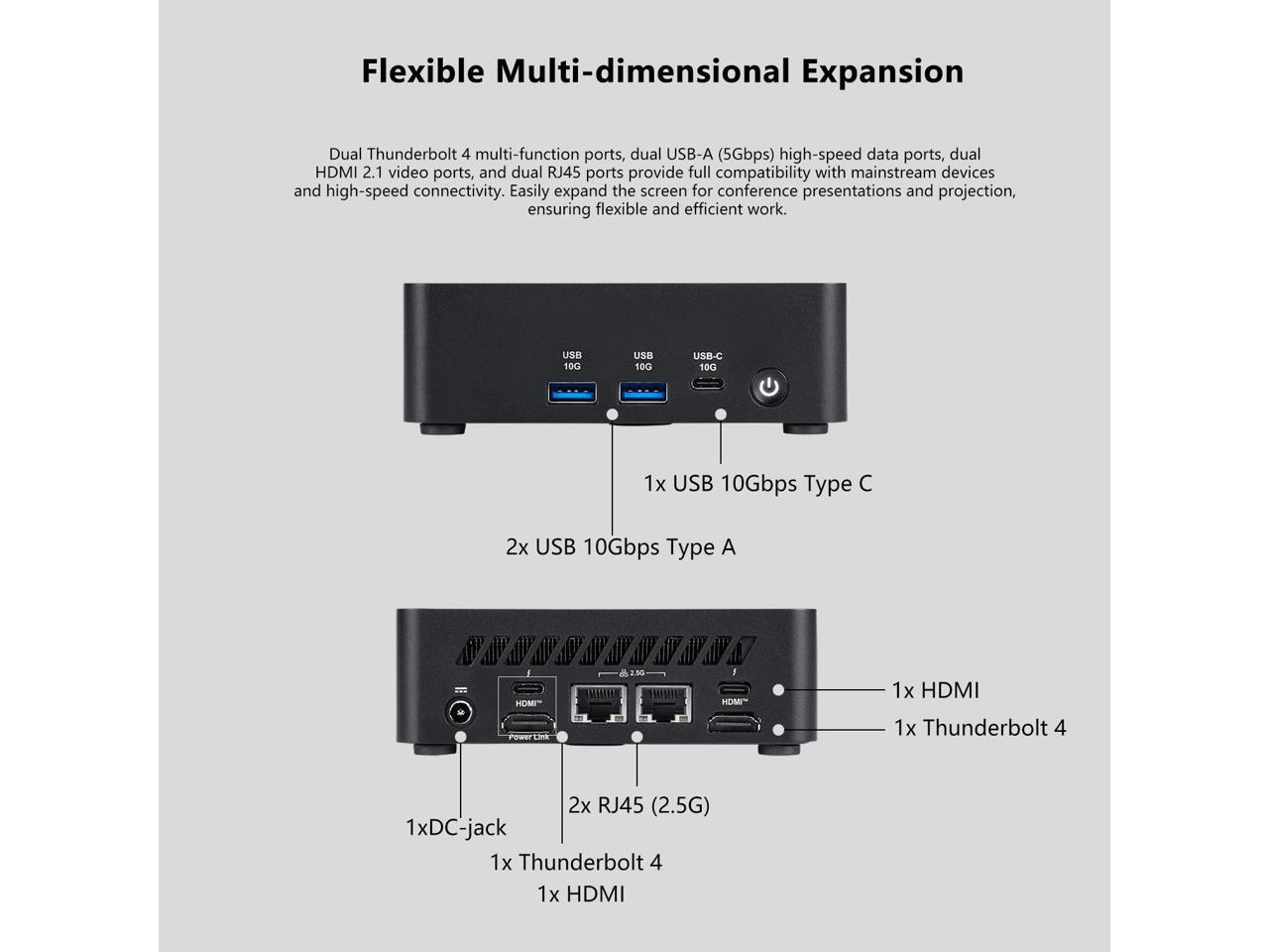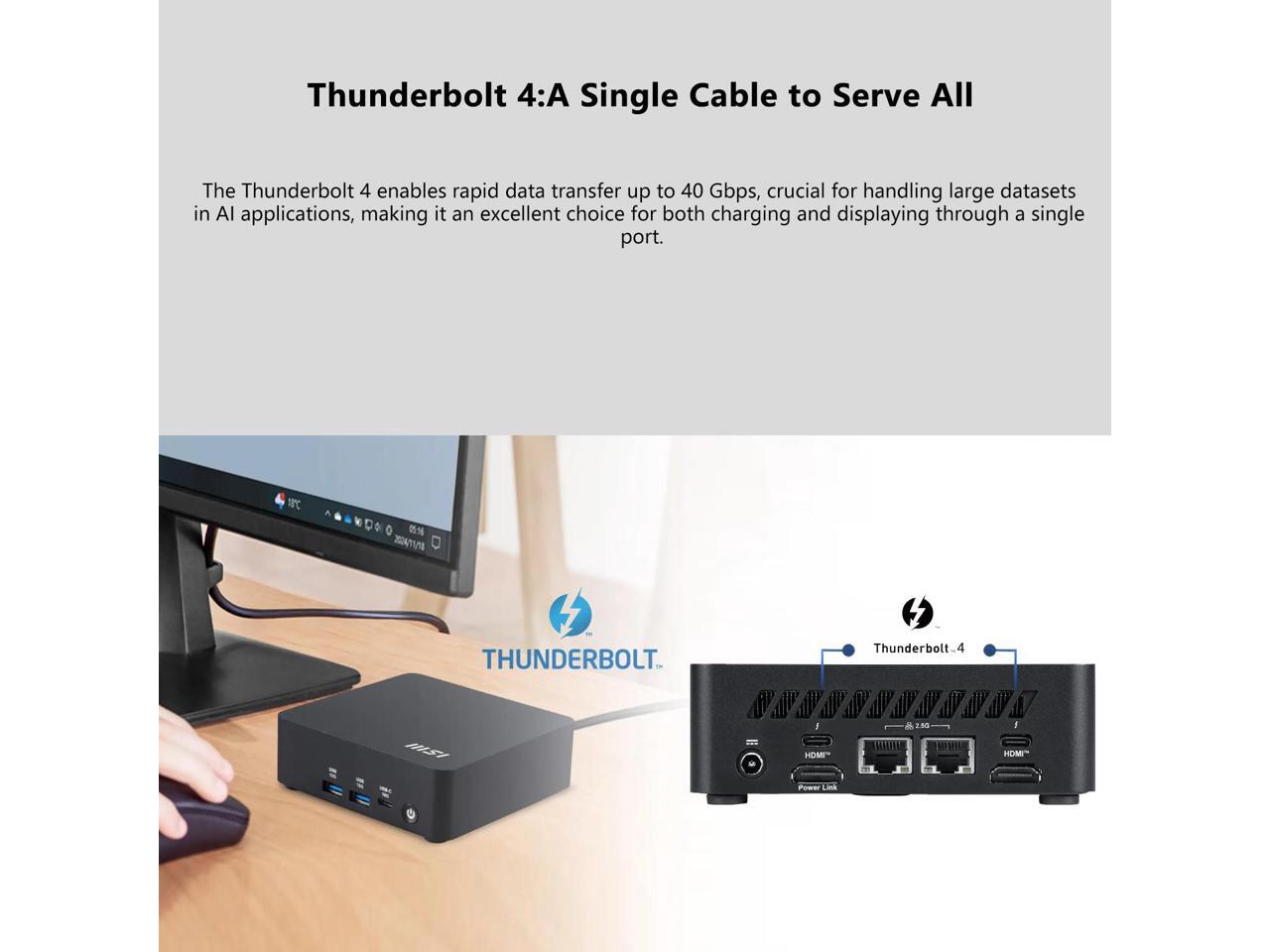 [Quad Display Support] 1x USB 10Gbps Type C, 2x USB 10Gbps Type A, 2x Thunderbolt 4, 2x RJ45 (2.5G), 2x HDMI, 1x Kensington Lock, 1x External Power Switch Pin Header, Wi-Fi 6E and Bluetooth.