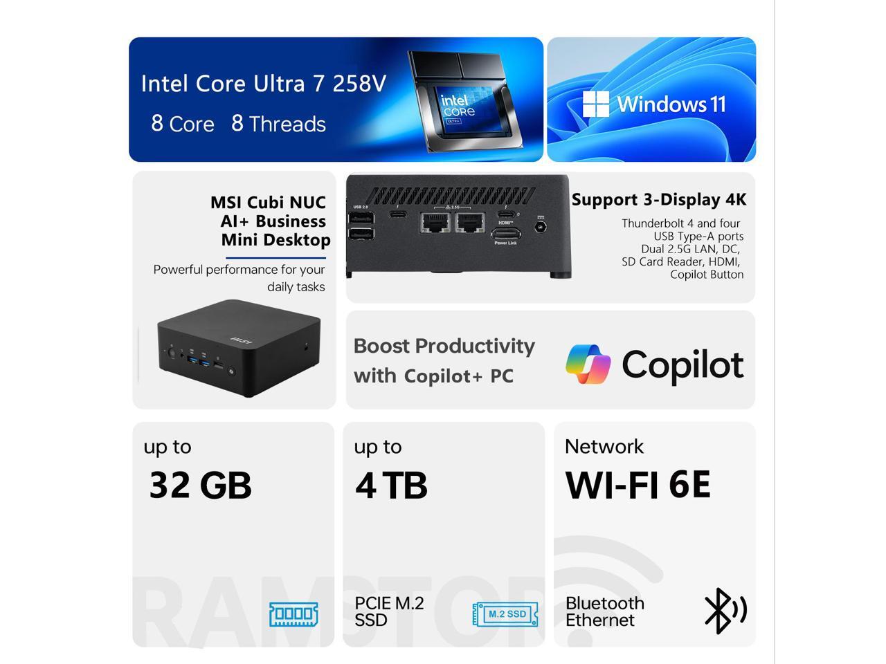 MSI Cubi NUC AI Business Mini Desktop, Intel Core Ultra 9 288V, 32GB LPDDR5X, 2TB SSD, Fingerprint, Thunderbolt 4, HDMI, Dual LAN, Wi-Fi 6E, Windows 11 Pro, Black