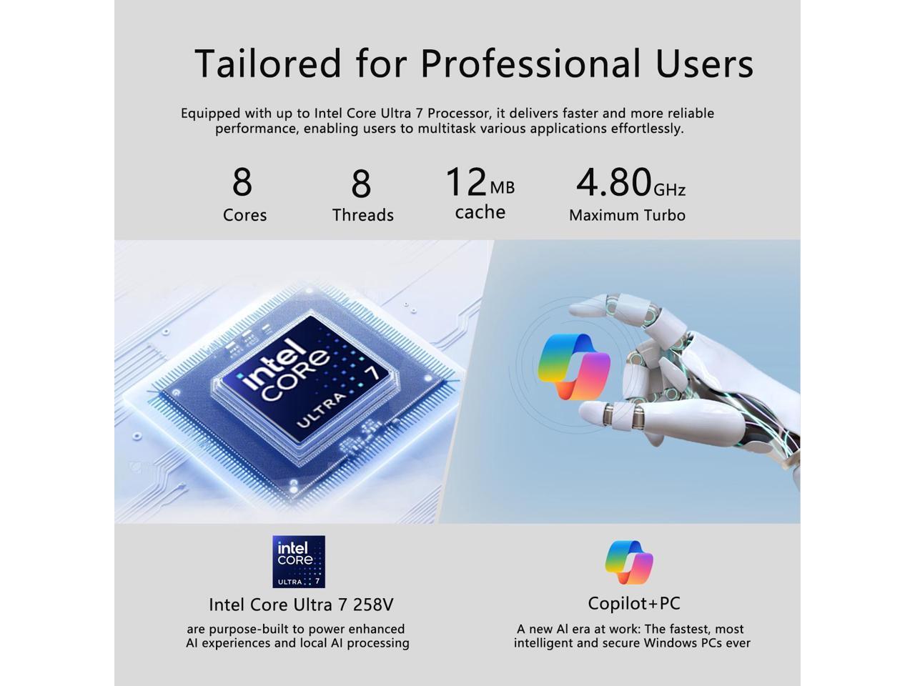 - [Next Gen Performance] Experience seamless multitasking and processing power with the Intel Core Ultra 7 258V (8 Cores, 8 Threads, 12MB L3 Cache, up to 4.8 GHz max turbo frequency).