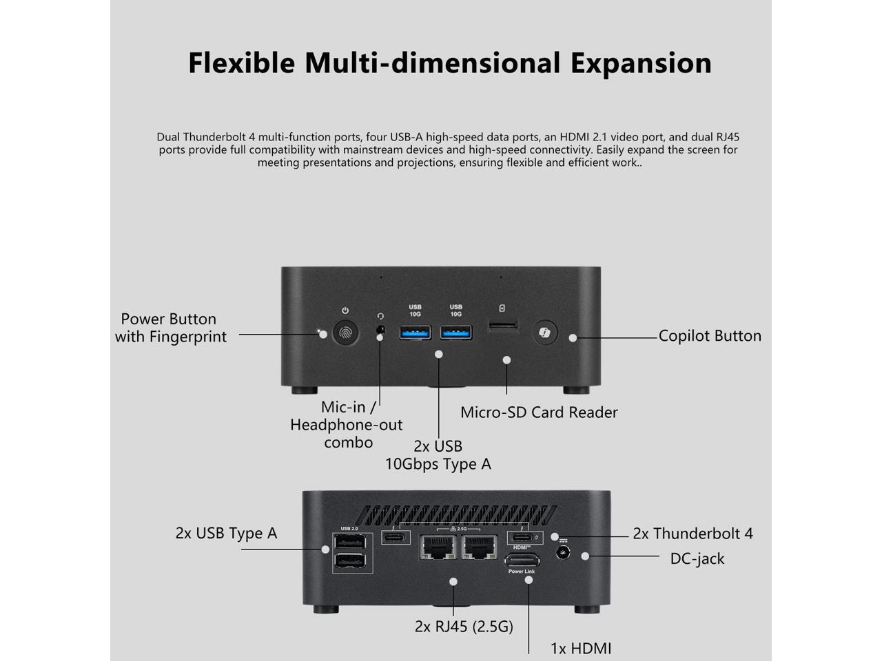 - [Quad Display Support] 2x USB 3.2 Gen2 Type-A, 2x Thunderbolt4, 2x USB 2.0 Type-A, 1x HDMI, 1x DC, 1x SD Card Reader, 1x Copilot Button, 2x RJ-45 (LAN), 1x Kensington Lock Slot, External Power Switch Slot, 1x Mic-in / Headphone-out combo, Wi-Fi 6E and Bluetooth.