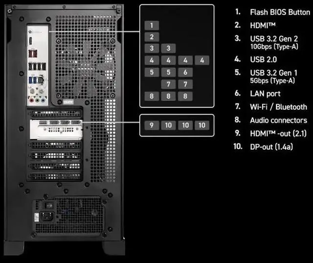 5 x USB-A 3.2, 1 x USB-C 3.2, 4 x USB 2.0, 1 x HDMI 2.1, 3 x DisplayPort 1.4a, 1 x RJ45 Ethernet