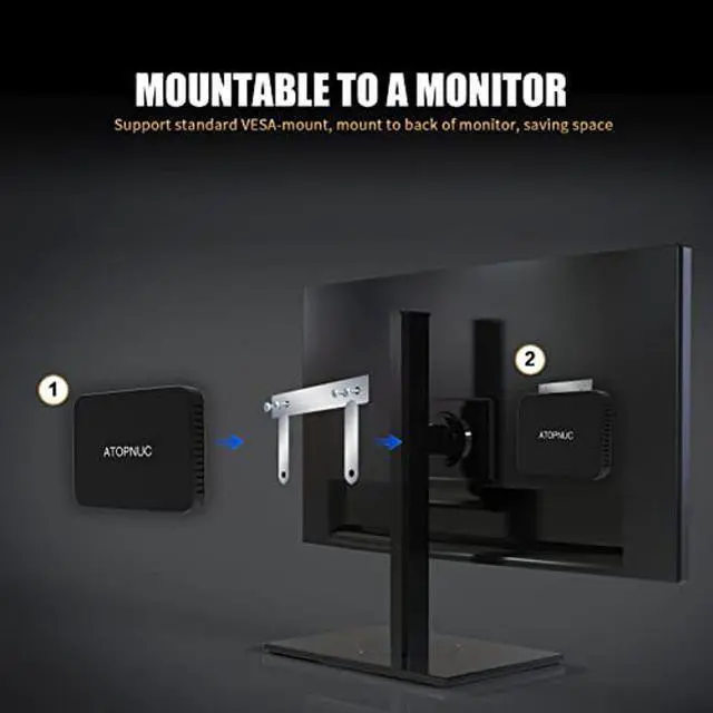 [4K Media Server] Dual video output VGA and HDMI, support 4K@30Hz video, ideal for home theater, play light games. The Mini PC is tiny and super light in weight, you could attach it to the back of a TV/Monitor (bracket included) or hide it almost anywhere.