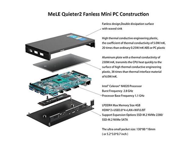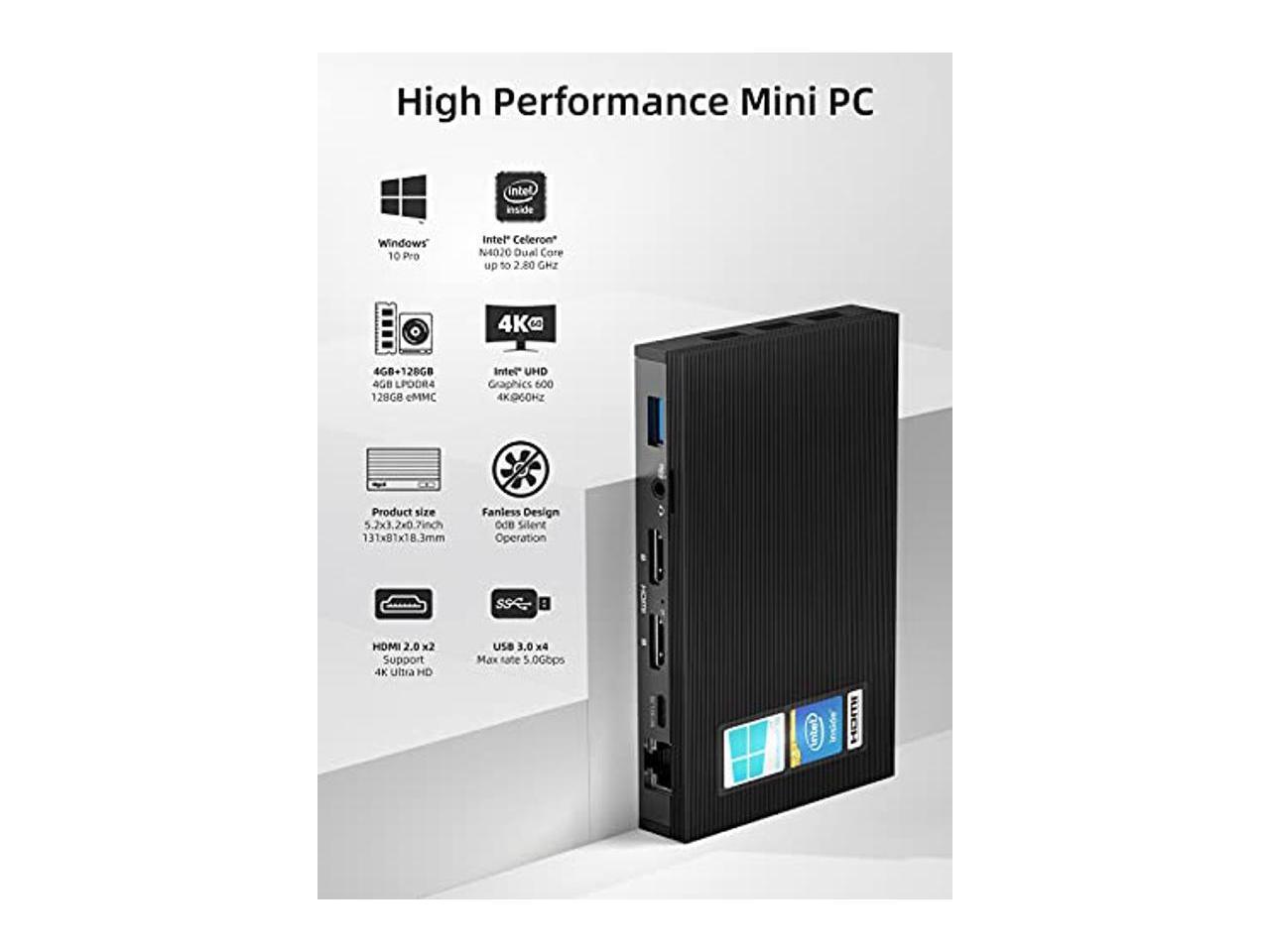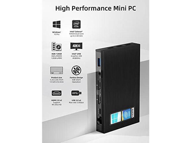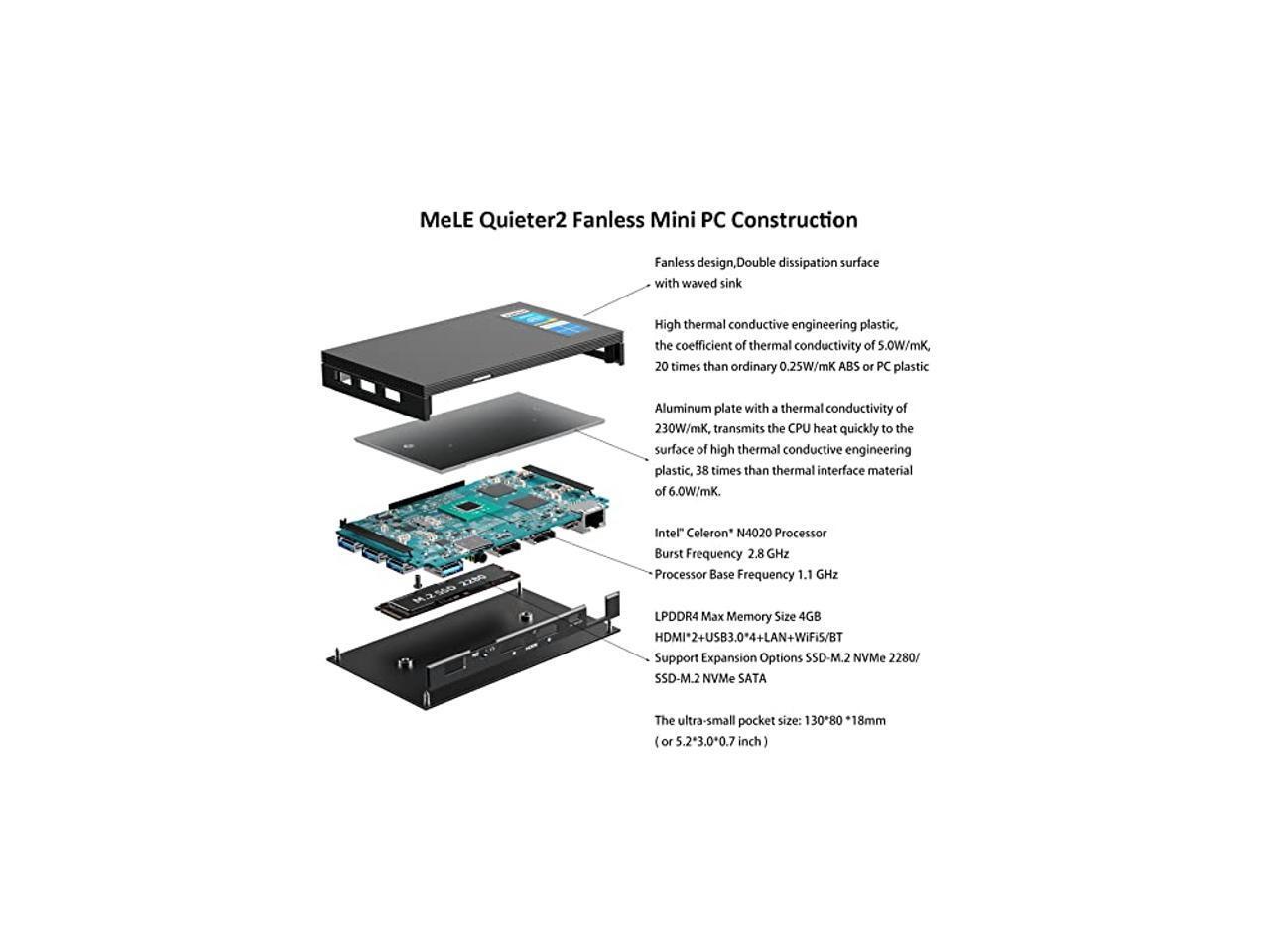Fast Running Speed ---This MeLE mini pc adopts Celeron N4020 processor,built in 4GB memory LPDDR4 and 128GB eMMC storage,burst frequency up to 2.80 GHz,adopts dual core,its TDP speed up to 6W,able to deal simple multiple tasks at the same time.