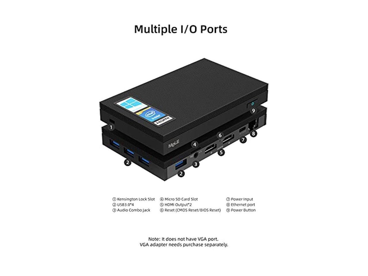 UHD600,Dual Monitor 4K@60Hz Display ---MeLE Quieter2D mini computer with UHD Graphics 600,support dual monitor display at 4K@60Hz. Deigned a 3.5mm Jack,supports auto stereo voice output and input for microphone. you can enjoy visual and stereo festival via this tiny mini pc cube.