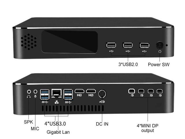 - 4*USB 3.0, 3*USB 2.0, 4*mini DisplayPort, 1*Auido in/1*Auido out, 1*RJ-45 network ethernet. This computer support four screen display at most. The middle HDMI are blocked, they are unavailable.