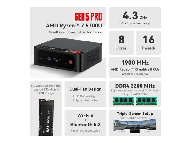 - AMD Ryzen 7 5700U Processor - The SER5 Pro Mini Computer is the upgraded version of the SER4 4700U mini PC, it's equipped with AMD Ryzen 7 5700U (8C/16T, L3 cache 8MB). The base frequency is 1.8GH