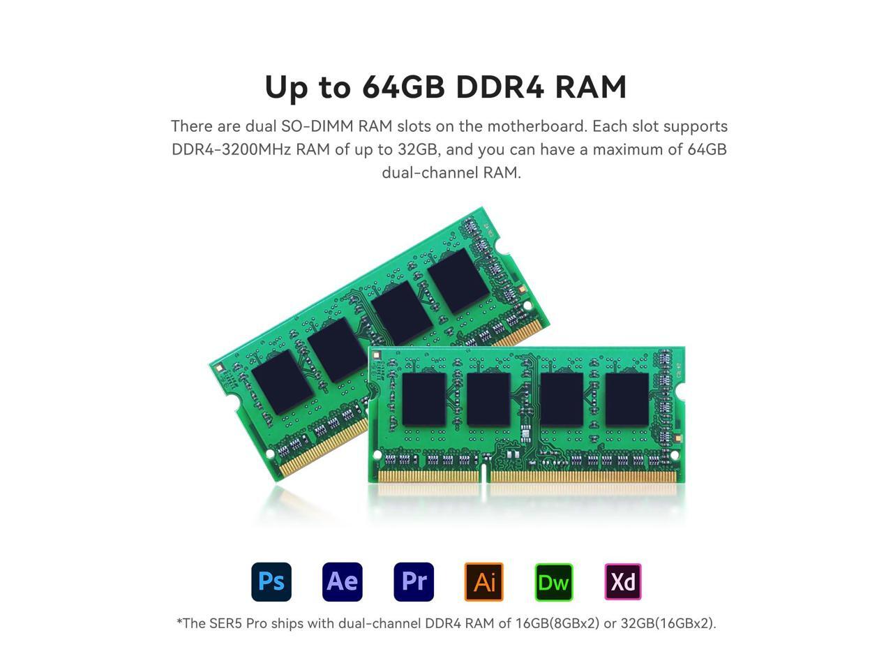 - 16GB DDR4 RAM and 500GB PCIe3.0 SSD - The Beelink SER5 Pro 5700U micro pc 16GB DDR4 3200MHz RAM and 500GB M.2 2280 PCIe 3.0x4 SSD, reading speed up to 3000Mb/S. Dual channel memory slots is expand