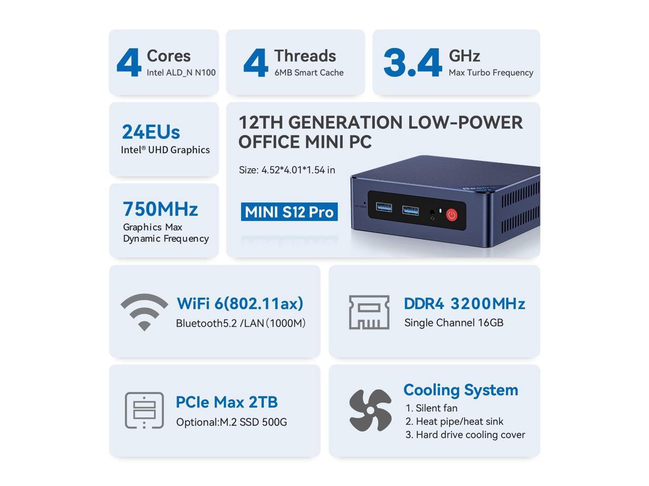 Latest 12th Intel Alder Lake-N100 - Beelink Mini S12 Pro mini pc is powered by 2023 Latest Intel 12th Gen processor Alder Lake-N100(4C/4T, 6M Smart Cache, up to 3.4GHz, 25W TDP) , delivers more