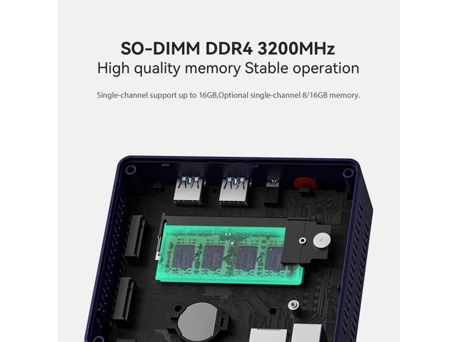 - High-capacity Storage:The Mini PC N150 built-in 16GB DDR4, 500GB SATA3 SSD, provides dual M.2 PCIe 3.0 slots (max 2*2TB),supports single-channel SODIMM DDR4 3200MHz memory (max 16GB), ensuring users a smooth experience when processing multiple tasks.