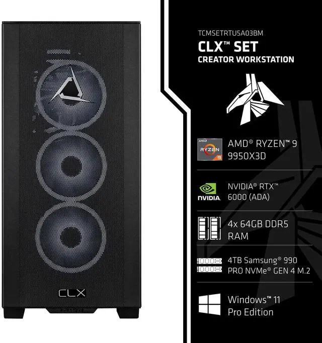 This CLX Set Creator Workstation is a refined tool for professionals who demand precision, speed, and reliability in their creative environments. Powered by the AMD Ryzen 9 9950X3D, this 16-core, 32-thread processor reaches up to 5.7GH z turbo, cooled by a robust 360mm liquid system to maintain peak performance under pressure. Whether you're rendering photorealistic scenes, editing high-resolution video, or training AI models, the NVIDIA RTX 6000 ADA with 48GB of ECC GDDR6 memory delivers studio-grade graphics and computational power. With 192GB of DDR5 RAM and a 4TB SSD, your workflow remains uninterrupted and lightning-fast.