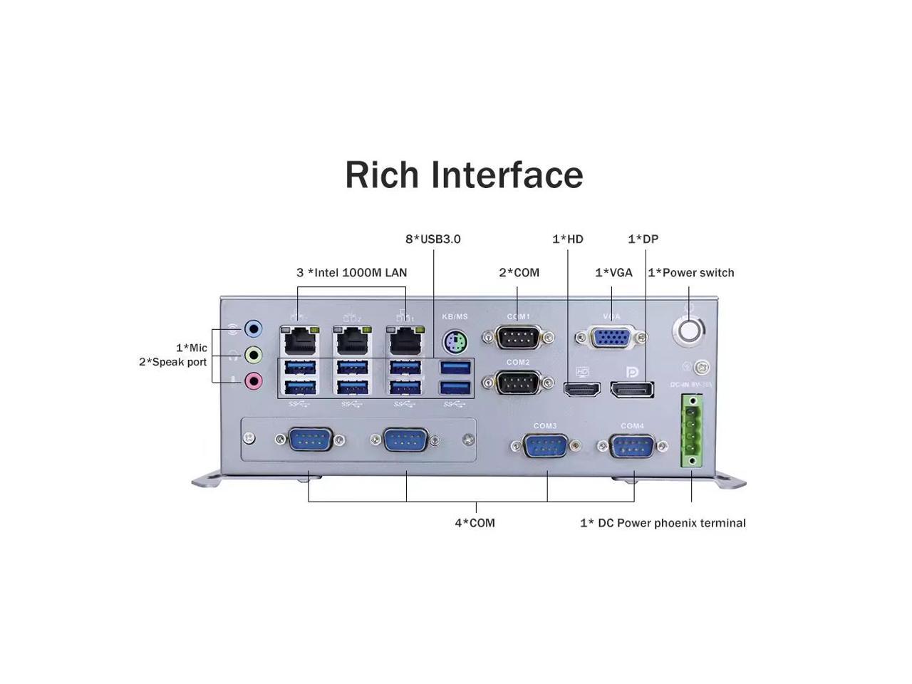 - Boasts a comprehensive array of ports, including SW, VGA, DP, HDMI, 6x COM (COM1, COM2 RS232/422/485 optional), PS/2, 3x LAN, 8x USB 3.0, mic, 2x speaker, and a DC Phoenix connector