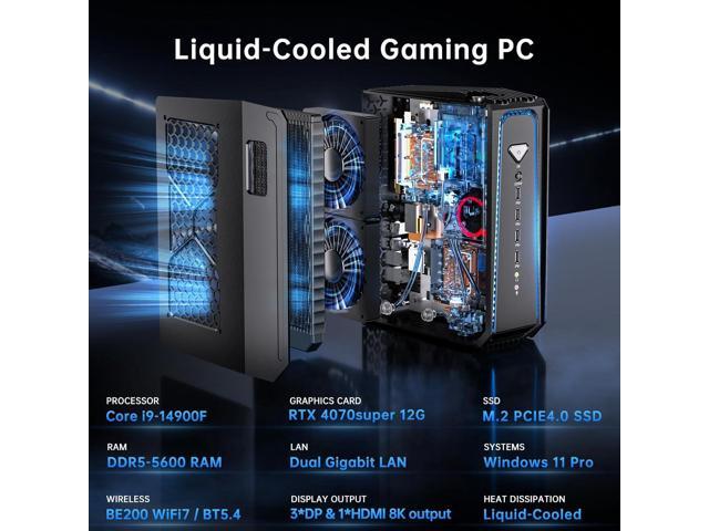 Partaker Mini Gaming PC, Liquid-Cooled PC, Desktop Computer, Core i5 14400F, GeForce RTX4070S 12G, 64GB DDR5 2TB M.2 PCIE4.0 SSD, Four Display, 8K@60Hz Outputs, Dual LAN, WiFi7/BT5.4