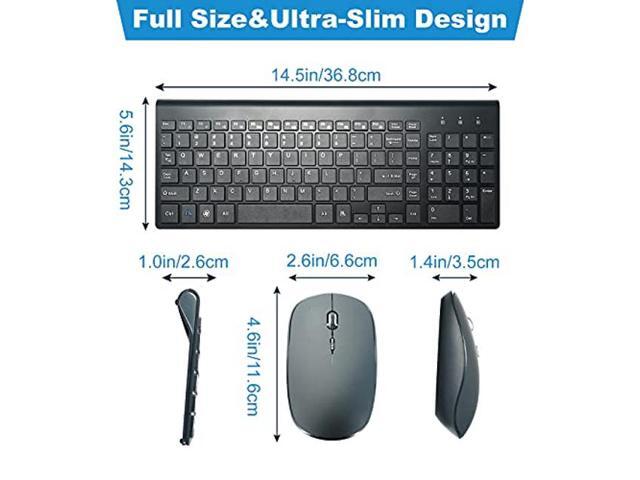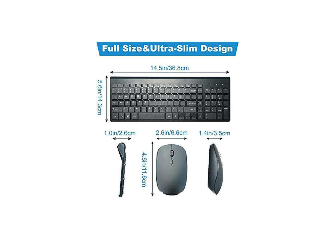 - [Slim and Ergonomic Design]-This ultra-slim full-size keyboard has a slight tilt angle for the more comfortable typing posture to relax your wrists.The numeric keypad simplifies your typing experience and the 12 multi-media shortcuts instant access your music,internet,e-mail,volume,etc.The ergonomically designed mouse provides a snug grip experience.