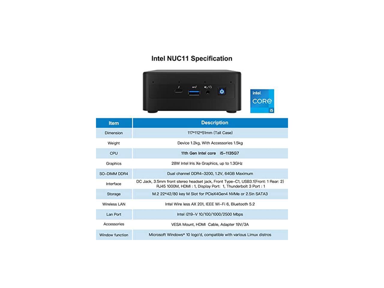 - [(Powerful Performance with 11th Generation Intel Core i5-1135G7 Quad Core)] 11th Gen Intel NUC Intel Core i5-1135G7 2.40GHz Processor (upto 4.2 GHz, 4 Cores, 8 Thead, 6 MB Cache, ) , 28W Intel Iris Xe Graphics, With US AC Cord.