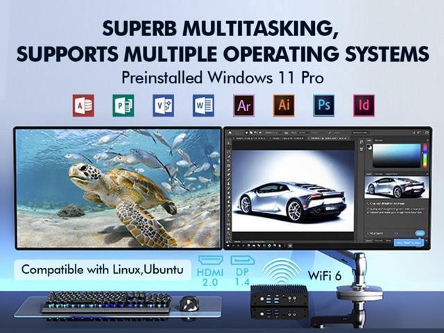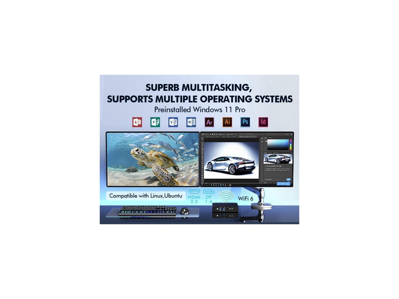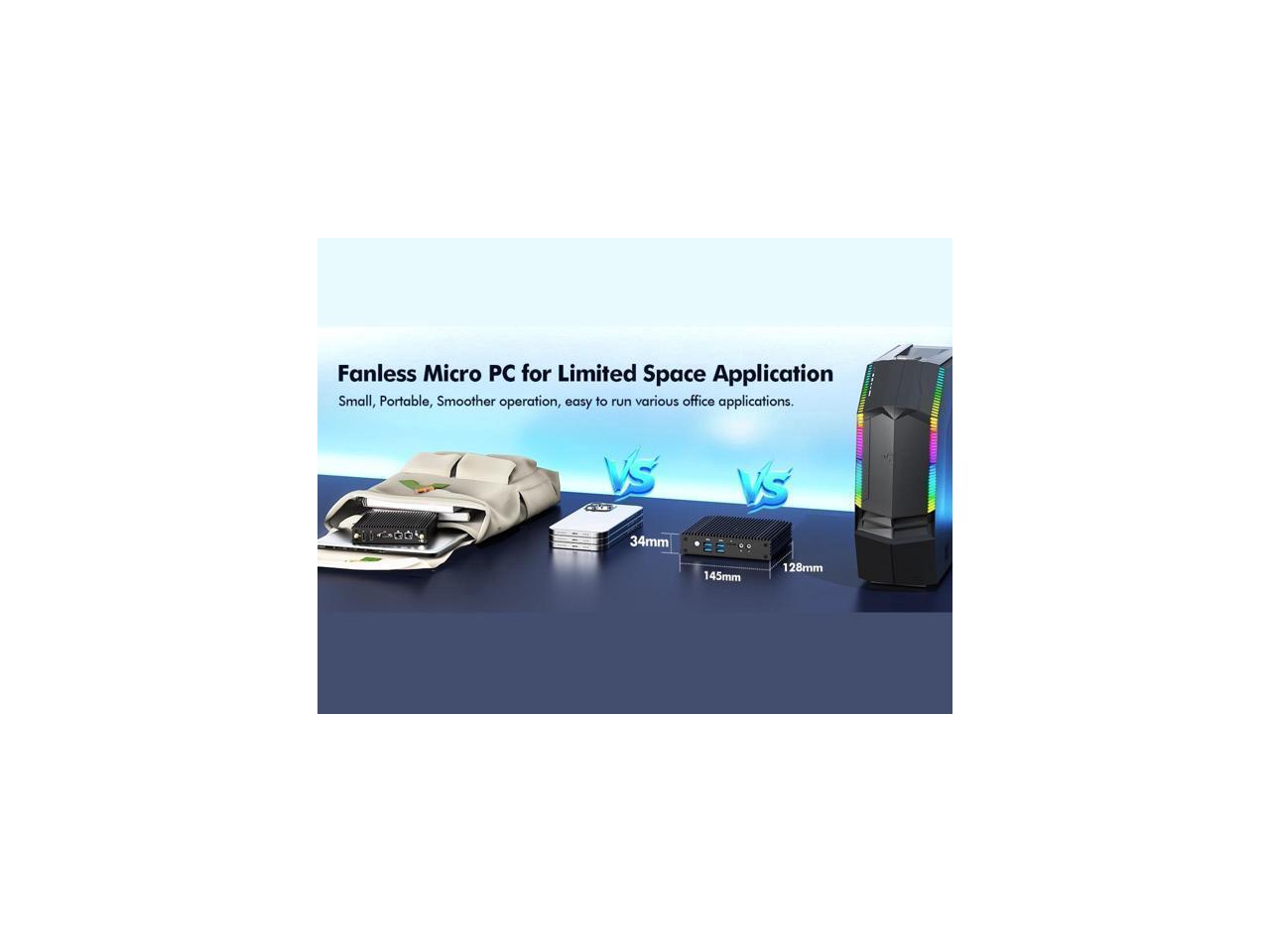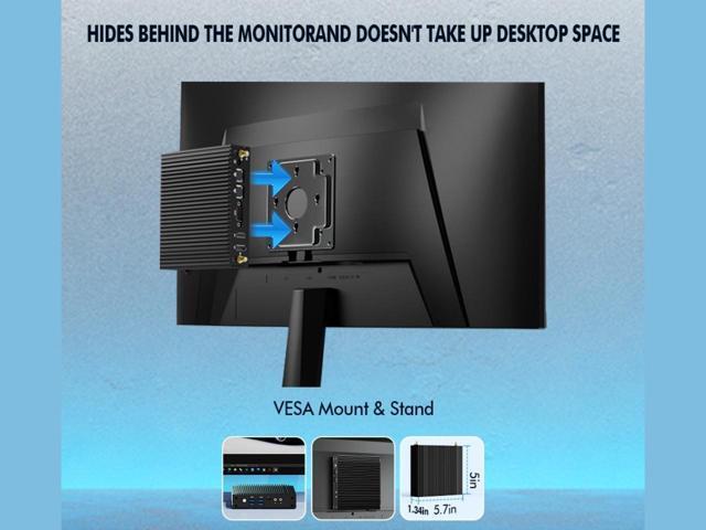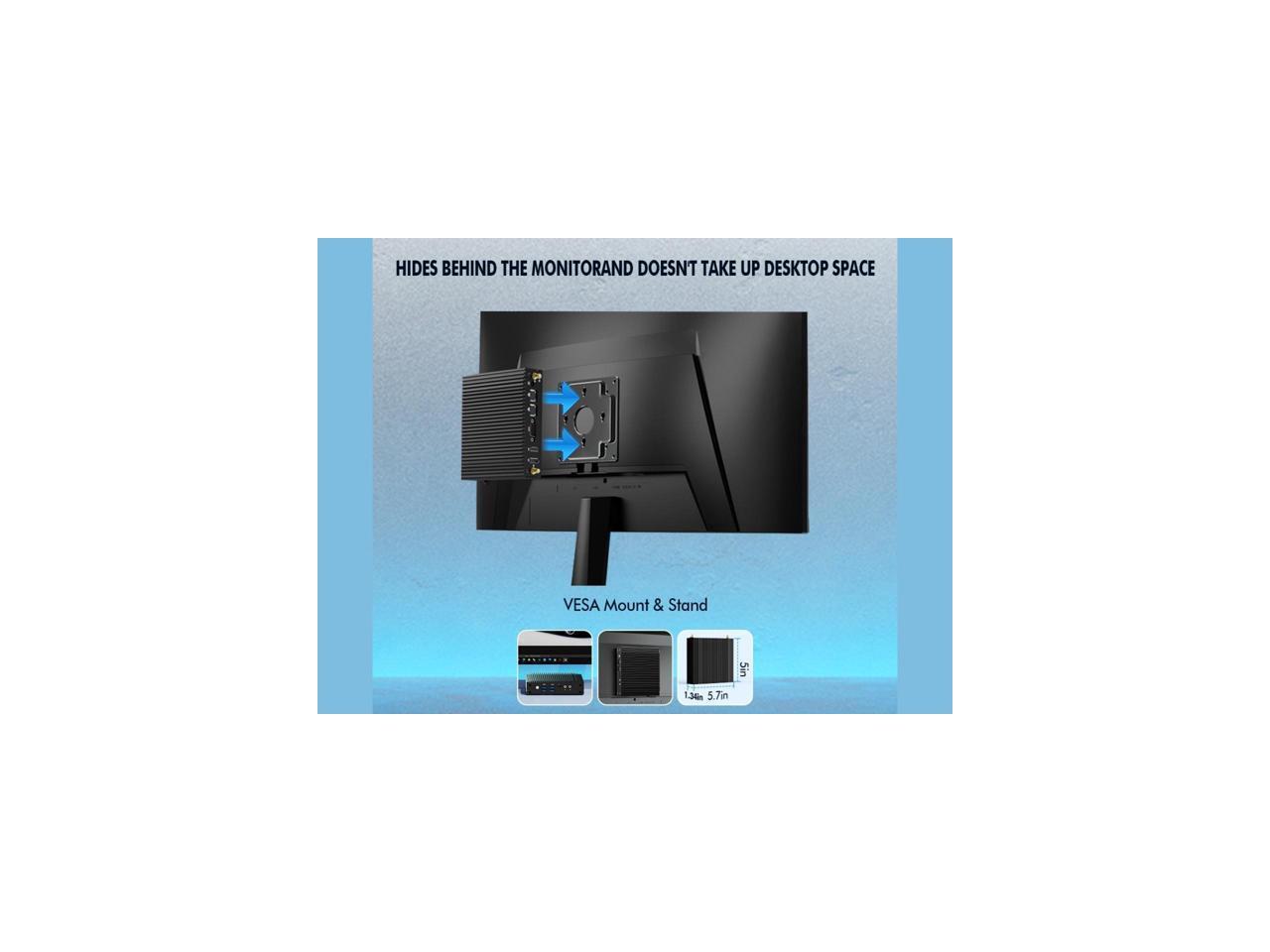 - [Ultra-Thin Body, Fanless Design] This Fanless Mini PC stands out with its ultra-compact 0.62L volume and featherlight design at 1.5lbs; It can easily be installed via VESA bracket and hide it behind the monitor.