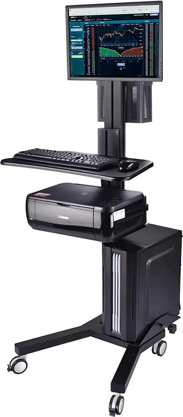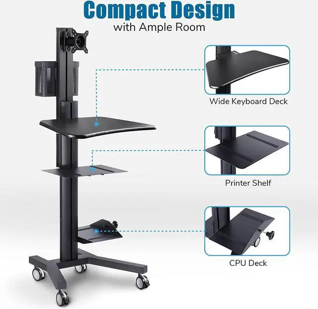Rolling Computer Cart Adjustable Mobile PC Standing Workstation with Monitor Mount Keyboard Tray Printer CPU Holder Wheels for Shop Home Office Black