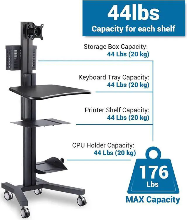 Heavy Duty & Durable - Heavy duty aluminum that is wear and corrosion resistant. Each shelf has a maximum load capacity of 44lbs, providing you a sturdy and stable working platform. Ideal for companies, home offices, warehouses, factories, medical stations, trade show booths, schools, laboratories, etc.