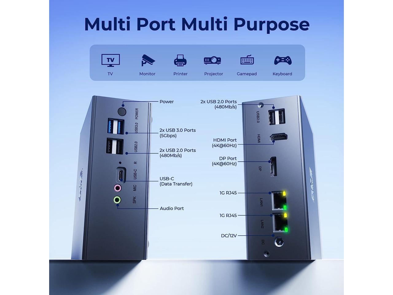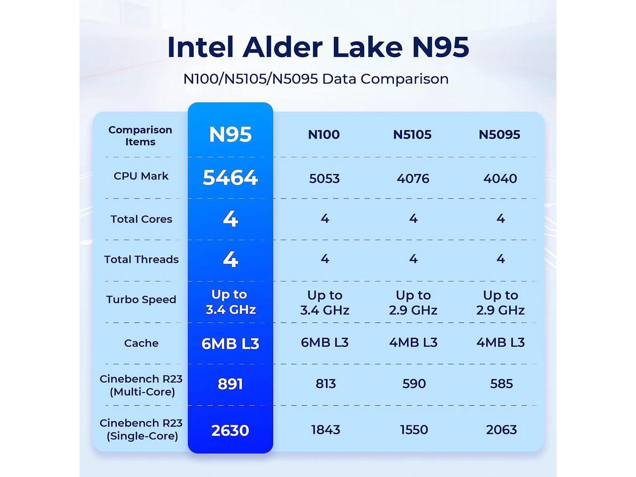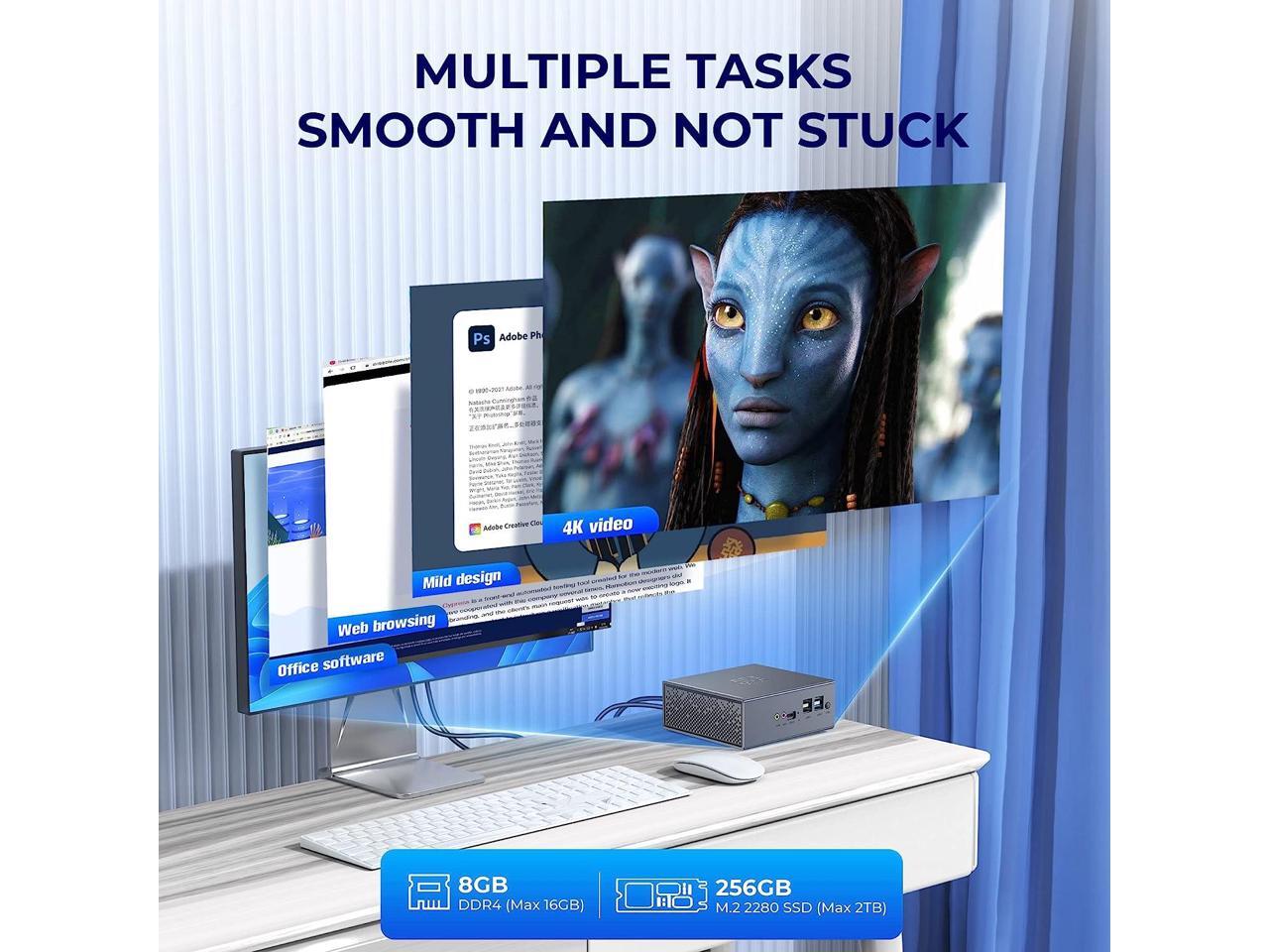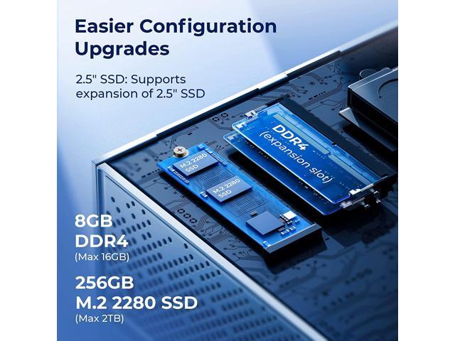 - Powerful Performance with the Latest Processor AD03 mini pc windows 11 pro is built-in faster 12 th Generation Intel N95 processors, Max Turbo Frequency up to 3.40 Ghz (4C/4T). If you are looking for a quiet and compact PC which will be used for visual home entertainment, streaming video, web browsing, work, that Intel N95 processors will be perfect for you. 8GB DDR4 & 256GB M.2 SSD Equipped With 8G DDR4 and 256GB M.2 SSD, AD03 Mini Computers n95 has better performance and more stable data transmission. Support expandable memory up to 16GB (not included), supports M.2 2280 NGFF SSD/ 2.5" SSD expansion up to 2TB (not included 4K@60Hz Dual Screen Display The Mini Computer equipped with Intel UHD Graphics eligible to support 4K@60Hz, which brings you more clearer, smoother video experience. allows you to connect two monitors at the same time, allowing you to work more efficiently and with max productivity!