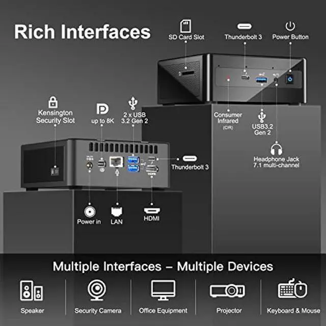 Conference Rooms and Live Collaboration - Our intel nuc 11mini PC can drive 4 x 4k displays or 8k display, Intel NUC 11 i5 offers HDMI ports and 2X Thunderbolt 3 connectivity, power all of your conference room technology, drive multiple displays and projectors, and stream live collaboration. Add cameras and interactive displays for immersive experiences