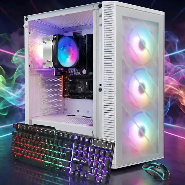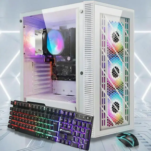 The STGAubron RGB PC Computer Desktop is engineered for users seeking robust performance and modern connectivity in a stylish, illuminated chassis. Powered by the AMD Ryzen 7 5700G processor with speeds up to 4.6GHz, this desktop delivers efficient multitasking and rapid responsiveness for both work and entertainment. It is equipped with 16GB DDR4 memory and a spacious 1TB SSD, ensuring fast boot times and ample storage for applications and files. Integrated WiFi 6 and Bluetooth 5.2 provide reliable wireless connectivity. The system includes four vibrant RGB fans and comes with an RGB keyboard and mouse, enhancing both aesthetics and user experience. Pre-installed with Windows 11 Home, this desktop offers a seamless and intuitive computing environment.
