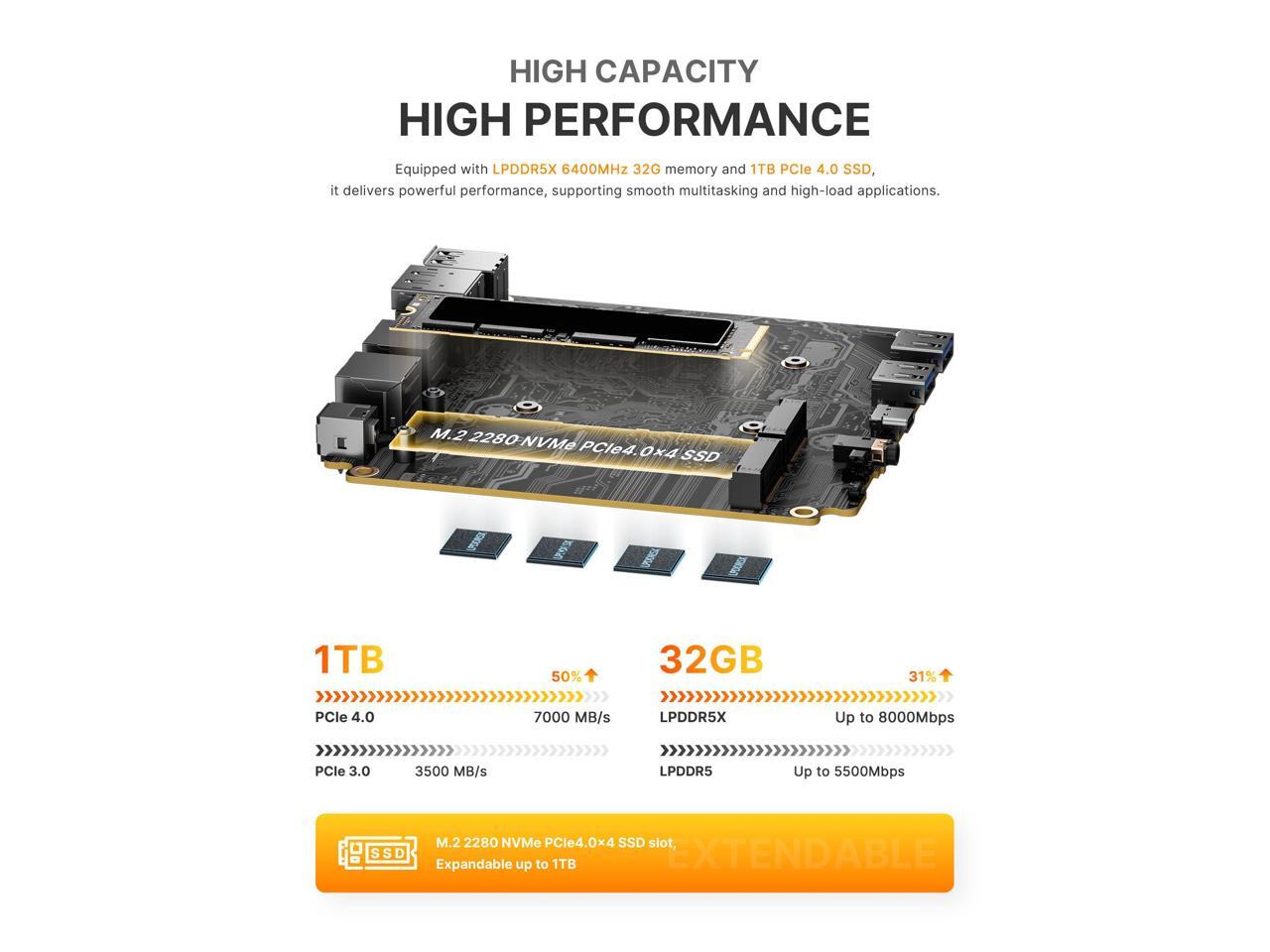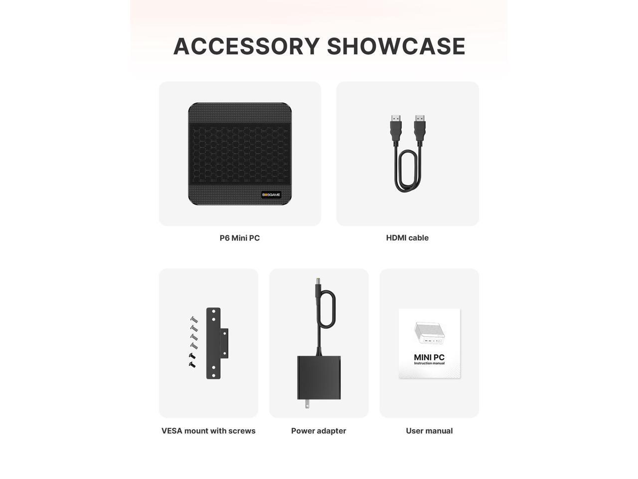 - 32G LPDDR5 & 1TB PCIe 4.0*4 NVMe SSD- Bosgame P6 Small PC has pre-installed LPDDR5-6400 Mhz 32GB RAM (On Board) + 1TB 2280 NVMe SSD(up to 4TB). The DDR5, with the super-fast PCIe4.0 SSD, expands the bandwidth greatly and runs the OS faster.