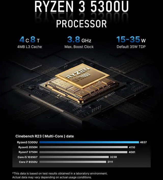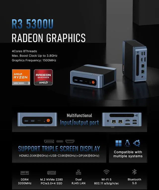 AMD RYZEN 3 5300U PROCESSORBOSGAME mini computers is equipped with AMD Ryzen 3 5300U processor (4C/8T, 4M Cache). manufactured using an advanced 7nm process. Its base clock speed is 2.6 GHz, with a maximum boost clock speed of up to 3.8 GHz.
