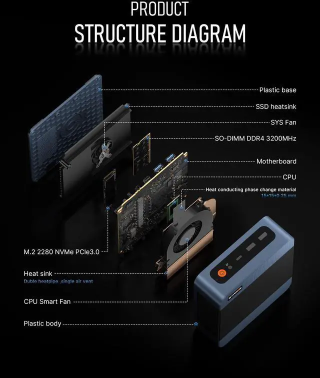 16GB RAM 1TB SSDThe E5 Mini PC is equipped with high-speed dual-channel 16GB DDR4 (up to 64GB)and M.2 2280 NVMe PCIe 3.0 x4 1TB SSD (up to 2TB), allowing the small PC to run several high-performance operations simultaneously.