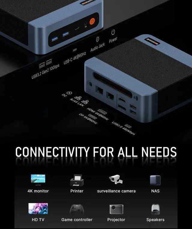 DUAL LAN PORTSDesign dual gigabit ethernet port design. Enjoy up to 1000Mbps data transmission speed. Ideal for working, gaming, and surfing the internet. And bosgame E5 mini pc gaming has dual-band Wi-F5, Bluetooth 5.0 with more substantial resistance to disturbance and a more stable wireless signal.
