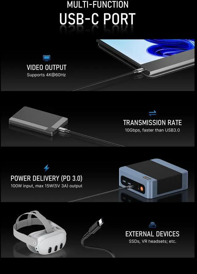 4K TRIPLE DISPLAY OUTPUTSMini gaming pc office supports triple display output with HDMI, DisplayPort, and Type-C ports. The GPU adopts Radeon Graphics (Max Graphics Frequency 1500MHz), supports ultra-realistic 4K visual effects, which can provide incredible clarity and maximum work efficiency.