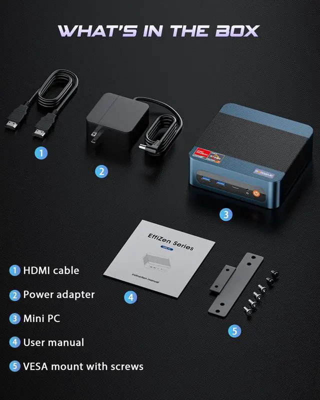 1x Mini PC, 1x Power adapter, 1x VESA mount, 1x HDMI cable, 1x User Manual |