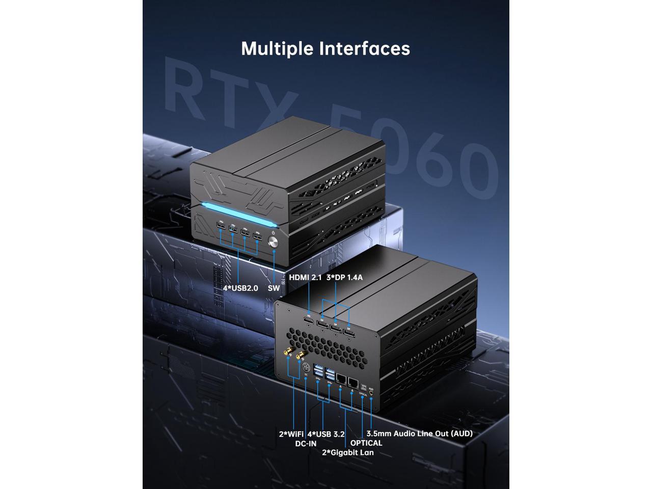 - [Rich Interfaces]: The mini computer is equipped with 1 x Power Button, 1 x DC Input, 4 x USB2.0 Type-A, 4 x USB3.2 Type-A, 2 x RJ45 LAN, 2 x WiFi Antenna, 1x Audio Jack, 1 x AUD, 3 x DP 1.4A, 1 x HD 2.1, 1 x Optical. It also has a built-in Intel BE200 network card, supports WiFi7 and Bluetooth 5.4, makes your desktop space tidier through wireless connection.