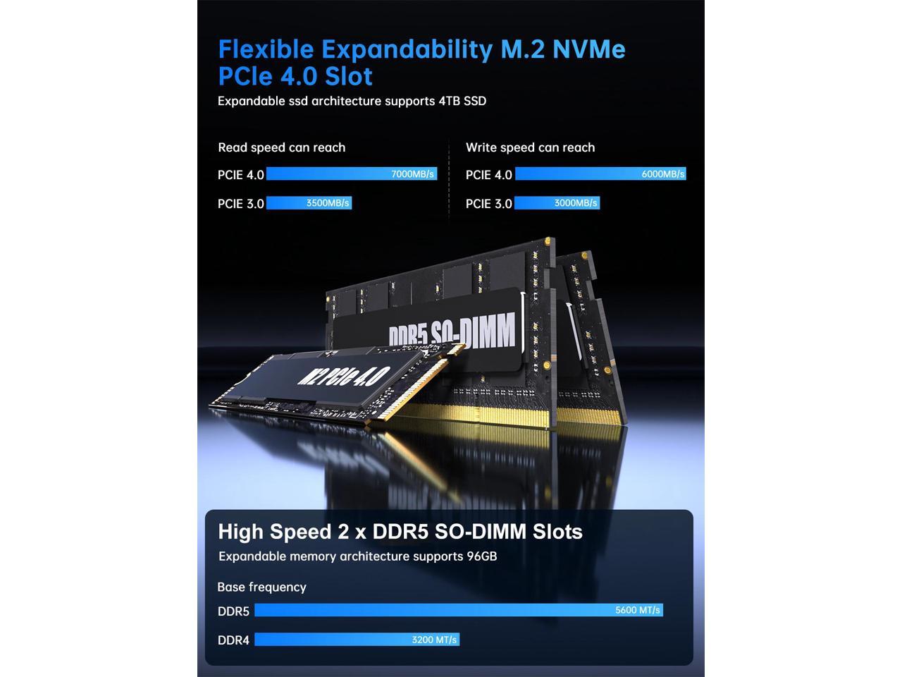 - [DDR 5 & PCIe 4.0]: The i9 mini pc is equipped with DDR5 dual-channel ram architecture with 2 x SODIMM slots, supporting speeds up to 5600Mhz and a maximum capacity of 96GB, and includes 1 x M.2 NVMe PCIe 4.0 SSD slot (up to 4TB) for lightning-fast data transfers, 1 x SATA 3.0 slots compatible with 2.5-inch SSDs or HDDs, each expandable to 2TB.
