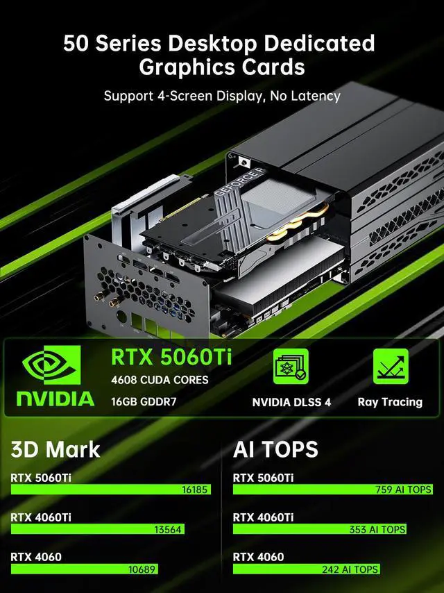 Graphics Card: GeForce RTX5060Ti Discrete Graphics, Basic frequency: 2.41GHz, Acceleration frequency: 2.57GHz, 16GB GDDR7, 128bit. CUDA: 4608
