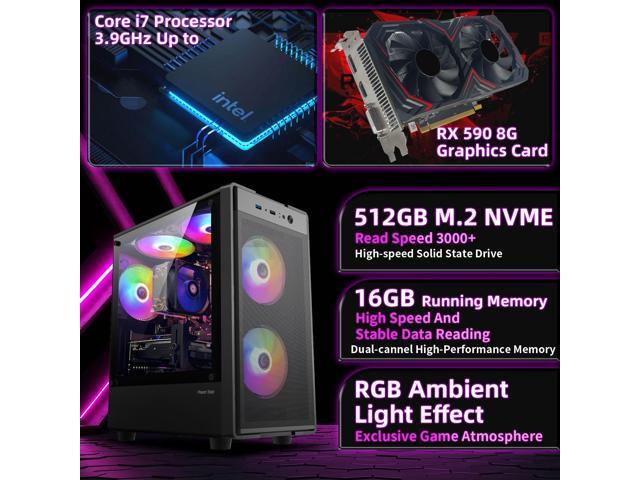 Prebuilt Gaming PC Desktop Computer,Intel Core i7 Desktop,Operating at A Frequency of 3.4-3.9 GHz,RX590 Graphics Card with 8GB GDDR5 Video Memory,16GB RAM, 512GB SSD,WiFi 5.0,RGB Fan x5