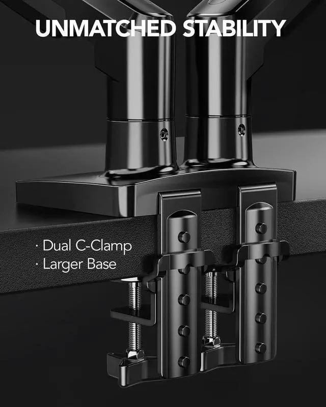 Dual C-Clamp Hold - Worried your dual monitors might wobble or slip? Our upgraded base uses a larger platform plus a dual C-clamp structure to lock the dual monitor arm firmly to your desk. Each arm safely keeps your screens steady while you type, click and gameno shaking, no sliding, just a clean and secure setup you can trust every day. It also provides Grommet Mounting installation choice, both options ensure stable and secure fixation for your 0.59 " - 3.54 " desk.