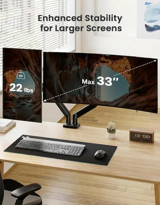 Height & Extension Adjustment - The dual monitor arm for 2 monitors can be positioned as high as 17.5 above the desk surface, allowing you to raise your screens closer to eye level for more comfort. The flexible arms can extend the screens 17.5 closer to you for a more immersive viewing experience.