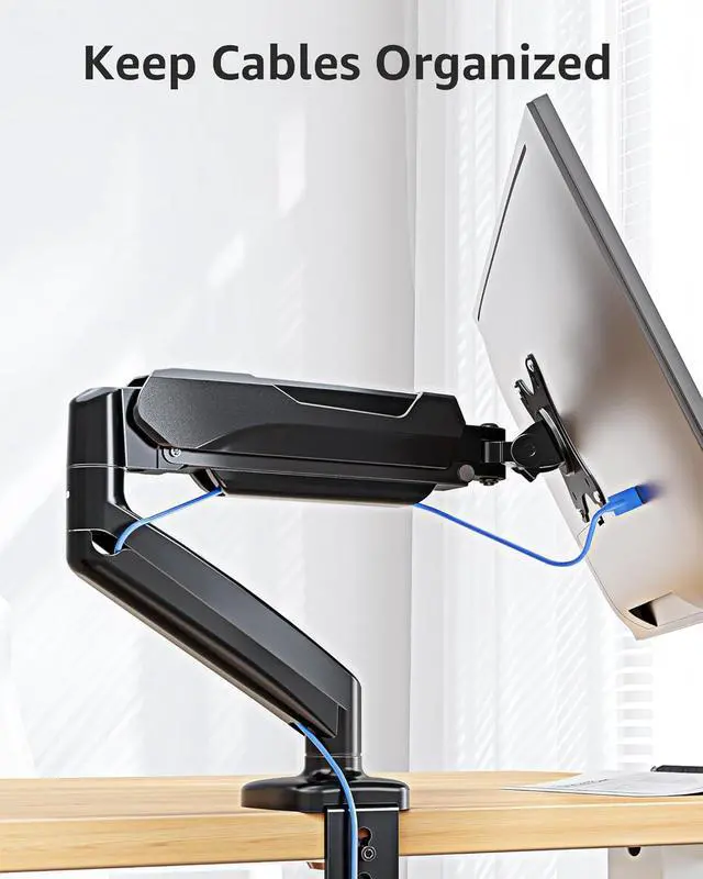 Free Up Your Desk Space: Heavy-duty monitor arm with built-in cable control professionally helping to hide wires. The single monitor stand releases more than 80% desktop space to place office accessories compared to a monitor holder with a large base while creating a more comfortable work environment. More desk space, better workflow!