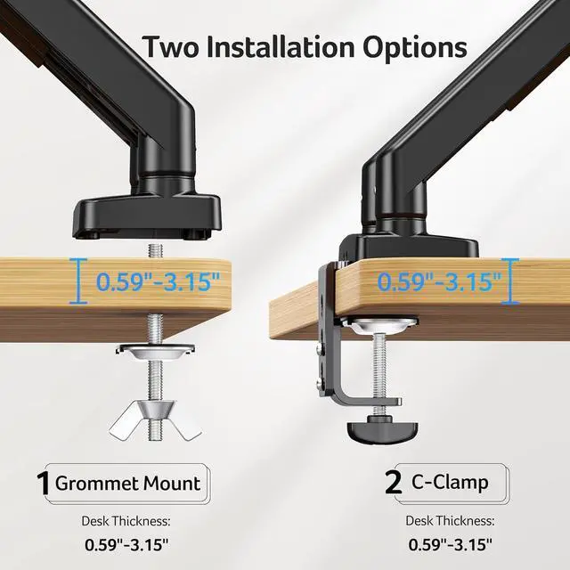 Flexible & Secure Mounting: This adjustable monitor mount offers flexible installation options with C-Clamp and Grommet mount (hole >10mm), suitable for desktops from 0.59 to 3.15 inches thick. dual monitor arm Use the C-clamp for a quick, drill-free setup or choose the grommet base for maximum stability on solid wood desks.