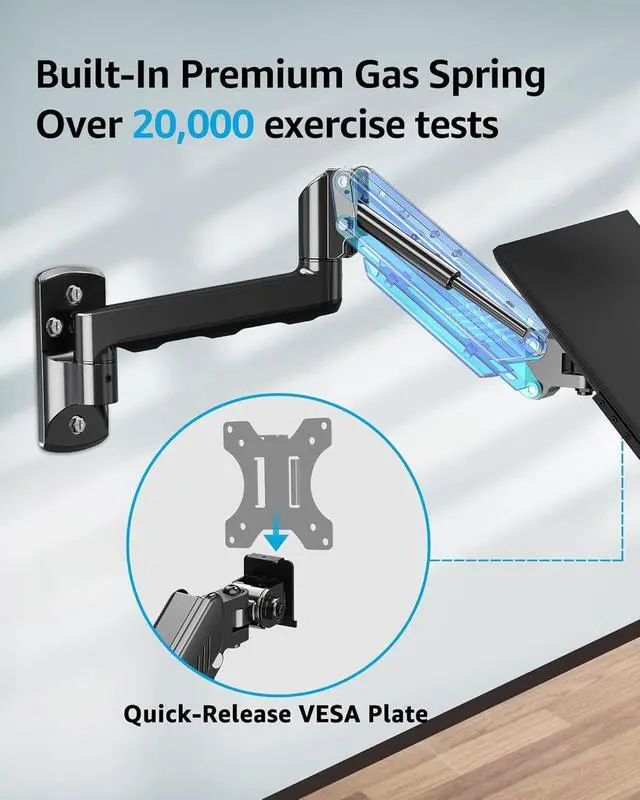 Sturdy Construction & Longer Life - Premium spring makes movement easier and smoother. Heavy duty VESA monitor wall mount built with quality aluminum securely holds the monitor stable.