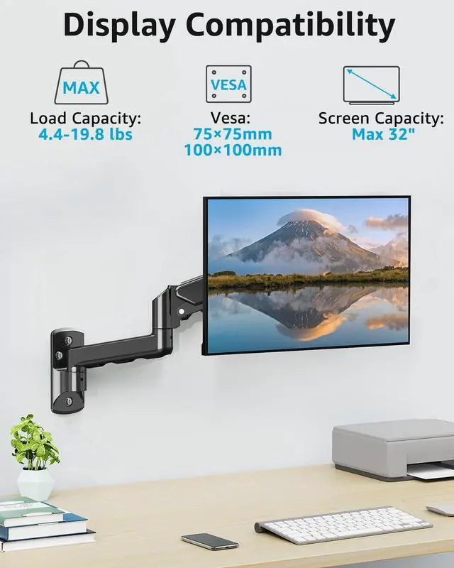 Universal Monitor Mount - The computer monitor wall mount fits for most flat or curved computer screens up to 32", holds 4.4 - 19.8 lbs, compatible with VESA pattern 75x75mm and 100x100mm. Designed for wood studs, brick, and concrete walls.