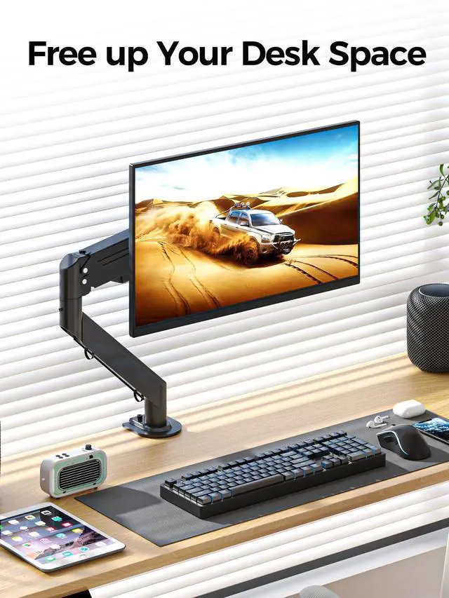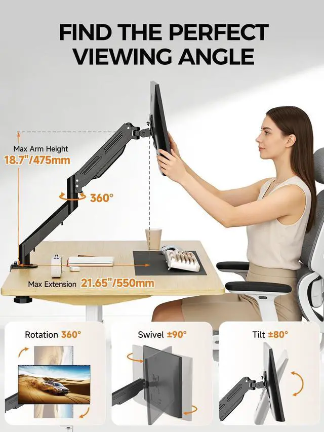 Gas Spring Arm Design - Our computer monitor mounts undergo rigorous testing to ensure durability and longevity, validated by over 20, 000 cycles of testing. The monitor arm can extend up to 21.65 " long. The height can be adjusted with the gas spring arm, maximum height of 18.7 inches.