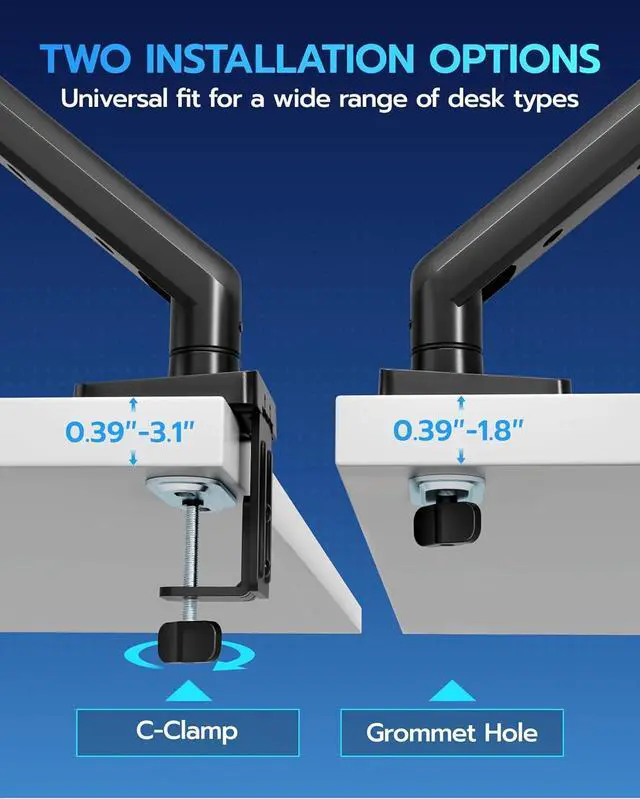 C-Clamp & Grommet BaseIt features full VESA compatibility (75x75, 100x100) and offers two versatile installation options C-Clamp ( 0.39 " - 3.3 " thick desks) or Grommet Mount ( 0.5 " - 1.8 " thick desks).