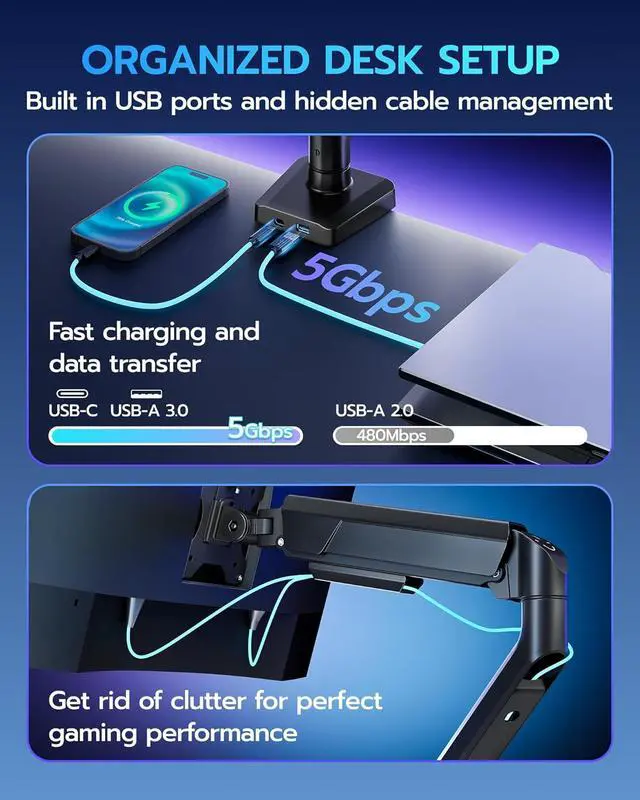 Integrated USB A/CMaximize desk space with built-in USB 3.0 ports and cable management effortless charging of your smartphones, game equipment and data transfer. Transforming your area into an organized gaming space.