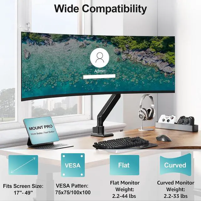Universal Compatibility - MOUNT PRO single monitor mount holds ultrawide screens up to 49", compatible with flat displays weighting up to 44 lbs and, supporting both 75x75mm and 100x100mm VESA patterns. The computer monitor stand works with flat or curved displays, including heavy-duty models like the Samsung Odyssey G9 and LG ultra wide monitors..